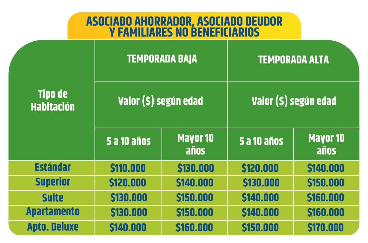 Las tarifas señaladas para Asociados, Beneficiarios, Invitados y Particulares, incluyen impuestos, seguro hotelero y desayuno.